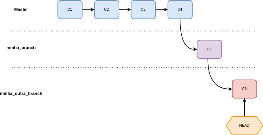 Vamos supor que estamos trabalhando na minha_outra_branch e quiséssemos realizar o merge com a master. Como as histórias foram sequenciais, não deveríamos ter qualquer conflito e o Git apenas aponta uma nova referência da master para o commit C6: